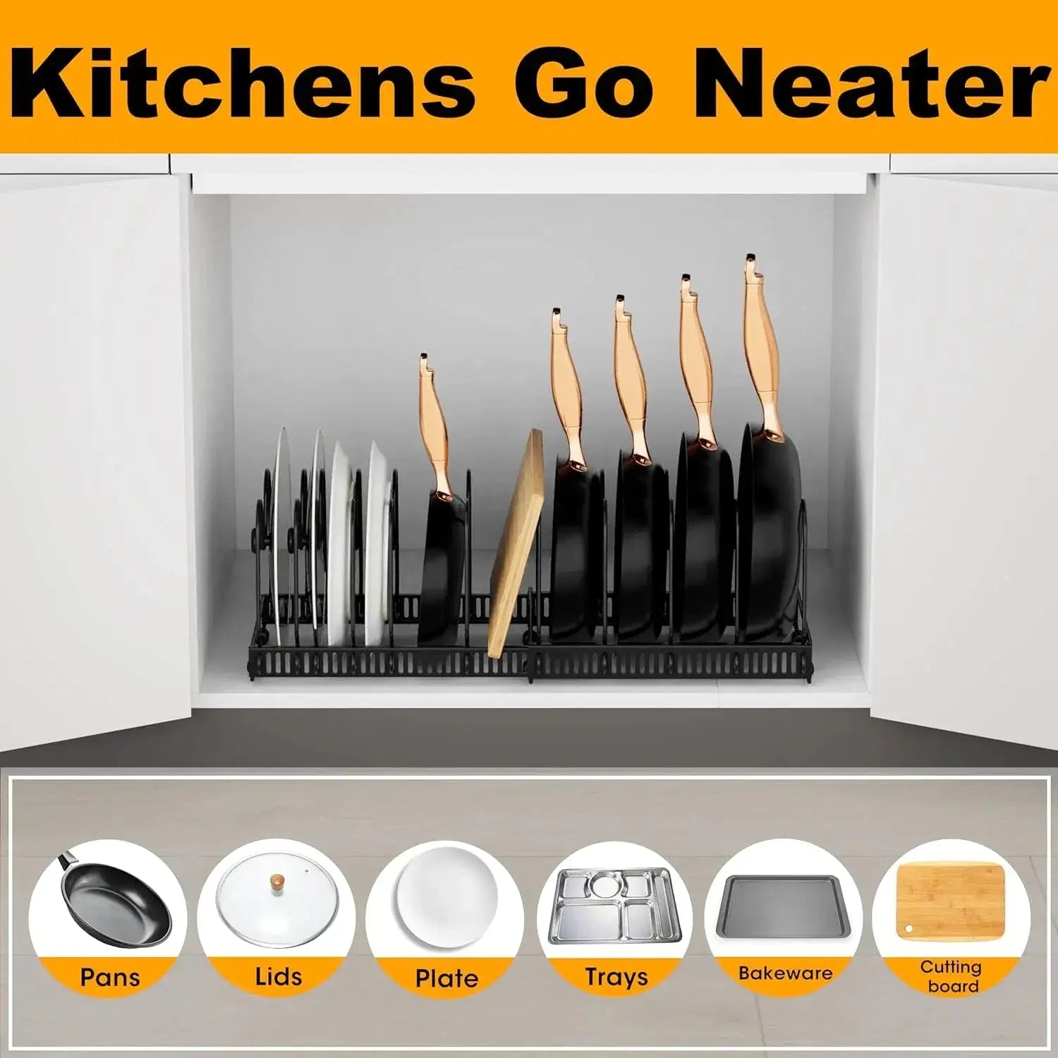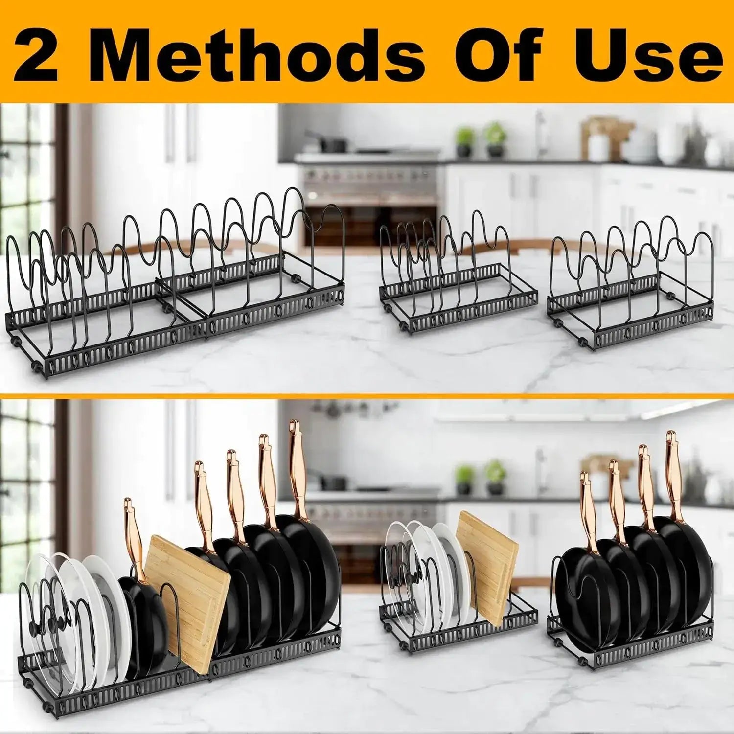 Specification Shipping Limitations: Unlimited Dimensions: 8.08 in. * 2.96 in. * 12.60 in. Weight: 2.65 lbs Available Ship to: United States Details 10+Pans Organizer Rack Helps You Store Pots, Pans, Lids, Cutting Boards And Other Kitchen Utensils More Conveniently, Making Your Kitchen Neat And Organized. This Pot And Pan Organizer For Cabinets Is An Adjustable Organizer. You Can Adjust The Lenght Of The Rack And The Width Of The Dividers To Accommodate Pots And Pans Of Different Heights. This Pot Rack Is Easy To Install And Can Be Completed In A Few Minutes Without The Need For Tools. It's Suitable For Use Where Space Is At A Premium Such As Smaller Or Busy Kitchens, It's Suitable For Use On A Counter Top, In A Cupboard Or Even Under The Sink To Reduce Clutter. [Product Information] Item Name: 10+ Kitchen Expandable Pot and Pan Organizer Assembly Dimensions of 2 Types : Combine 22.83 x 7.09 x 7.48 Inches, Weight: 2.66 lbs. Color: Black Material: Metal Finish: Black Paint Free Up Your Kitchen Cabinets With Our Expandable Pot And Pan Organizer Rack, Perfect For Various Cookware Sizes. Keep Your Countertops Clutter-Free And Your Essentials Within Easy Reach.Organize Pots, Pans, And Lids With 10 M-Shaped Dividers, Providing A Secure And Tailored Storage Solution. Create A Tidy Kitchen With Dividers Uniquely Designed To Hold Lids In Place, Adapting To Your Needs. Stack Up To 10+ Pans Effortlessly, Making It Ideal For Smaller Kitchens, Busy Cooks, Or Anyone Aiming To Reduce Clutter. Choose The Color That Complements Your Kitchen Decor - White Black Or Bronze. Adjust The Rack's Length (12" To 23") To Fit Your Space Perfectly. Use It As A Single, Expansive Rack Or As Two Separate Pieces For Secure And Convenient Storage That Suits Your Kitchen Layout. Satisfactory Service:Our Commitment Is To Deliver Topquality Products And Exceptional Service. If You Have Any Issues With Our Pot And Pan Rack, Just Contact Us For A Replacement Or Refund.